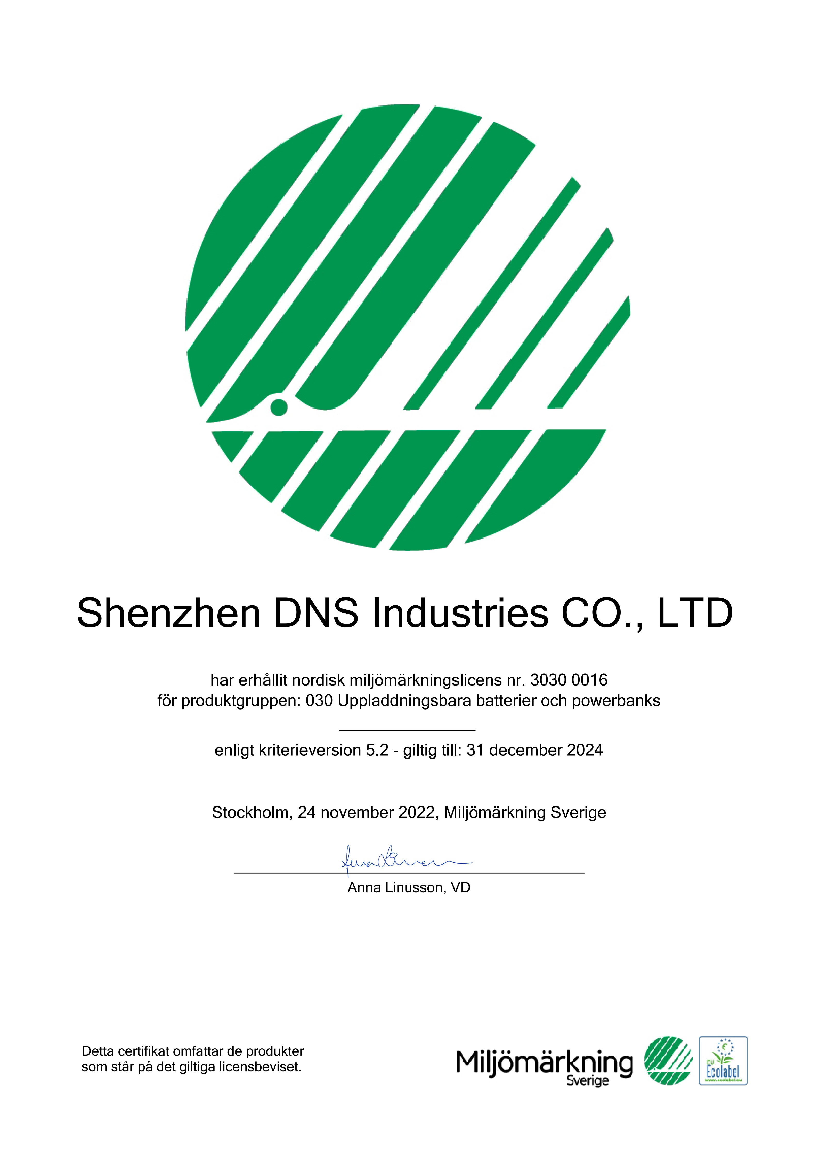 11月25日,深圳市和宏实业股份有限公司获得北欧白天鹅生态标签(Nordic Swan Ecolabel)认证, 成为全球首个获得充电宝北欧白天鹅生态标签认证的公司。庆祝和宏加入白天鹅家族,共同为绿色转型而努力。